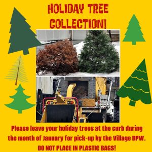Holiday Tree Collection Posted on January 5, 2026 by Ruby BinghamThe Village DPW will collect natural holiday trees throughout the month of January. Please place your tree at the curb. Do NOT put trees in plastic bags.