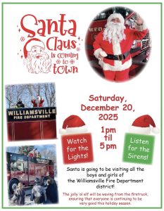 Santa is Coming to Williamsville! Posted on December 16, 2025 by Ruby BinghamSanta FlyerSanta will be driving around the Village of Williamsville on Saturday December 20th from 1 PM until 5 PM on a Williamsville fire truck. Keep an eye out for him!